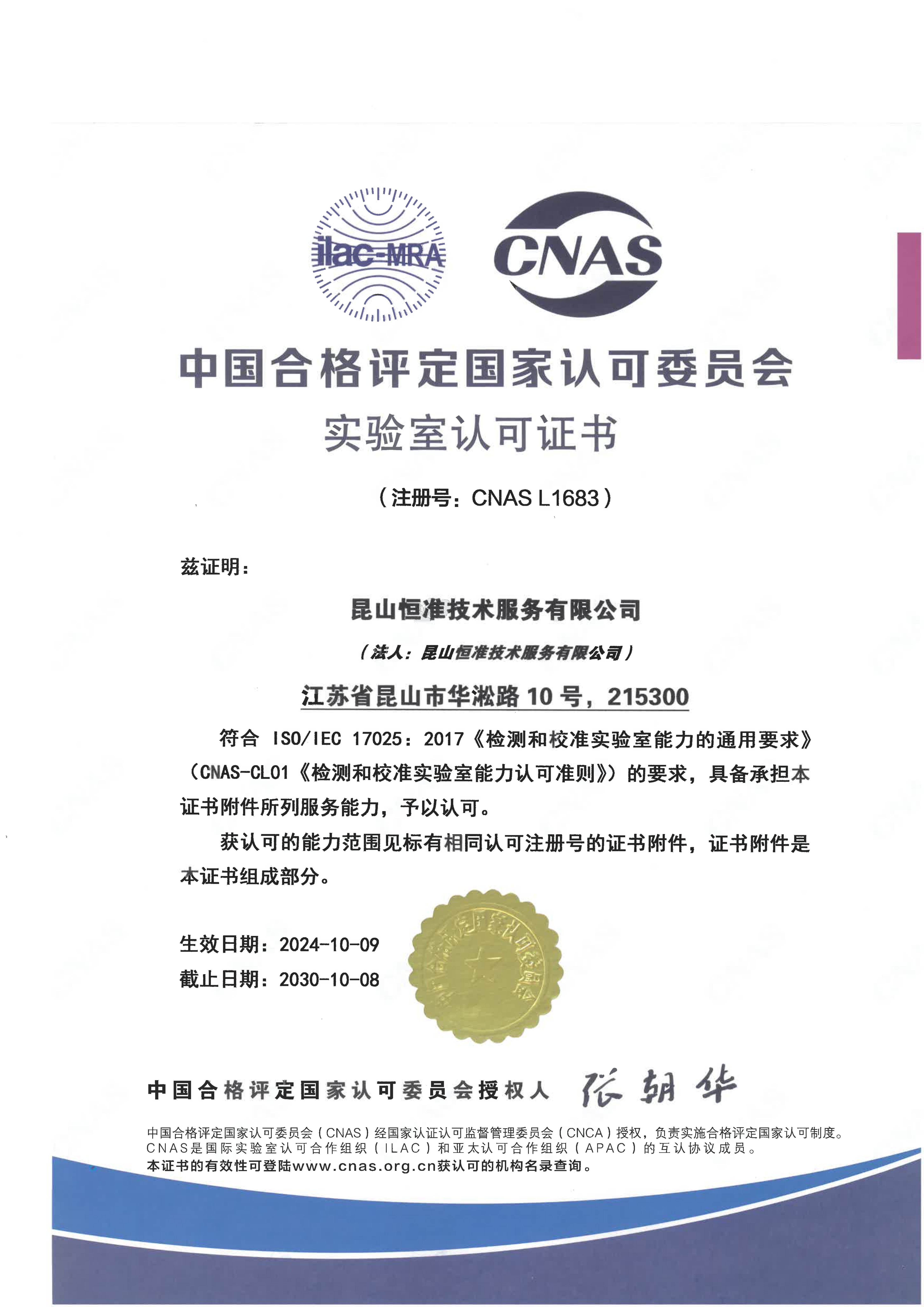 " 昆山恒準(ETS),是具外資性質校準實驗室中成立時間長、規模最大、最具影響力的專業第三方計量校準機構,出具的計量校準證書具有國際公信力. 一直潛心專注于精密儀器、設備的校準服務,執著于『看不見的質量』,堅持『勇于負責,確實做好每一次校準工作』的服務態度,讓客戶體驗真正負責任第三方實驗室的服務理念. 目前已經獲得中國合格評定國家認可委員會(CNAS)認可項目300多項(NO.L1683),每年持續增加校準項目,提供客戶更全面服務,已累積獲得近萬家客戶的認可和大力支持.